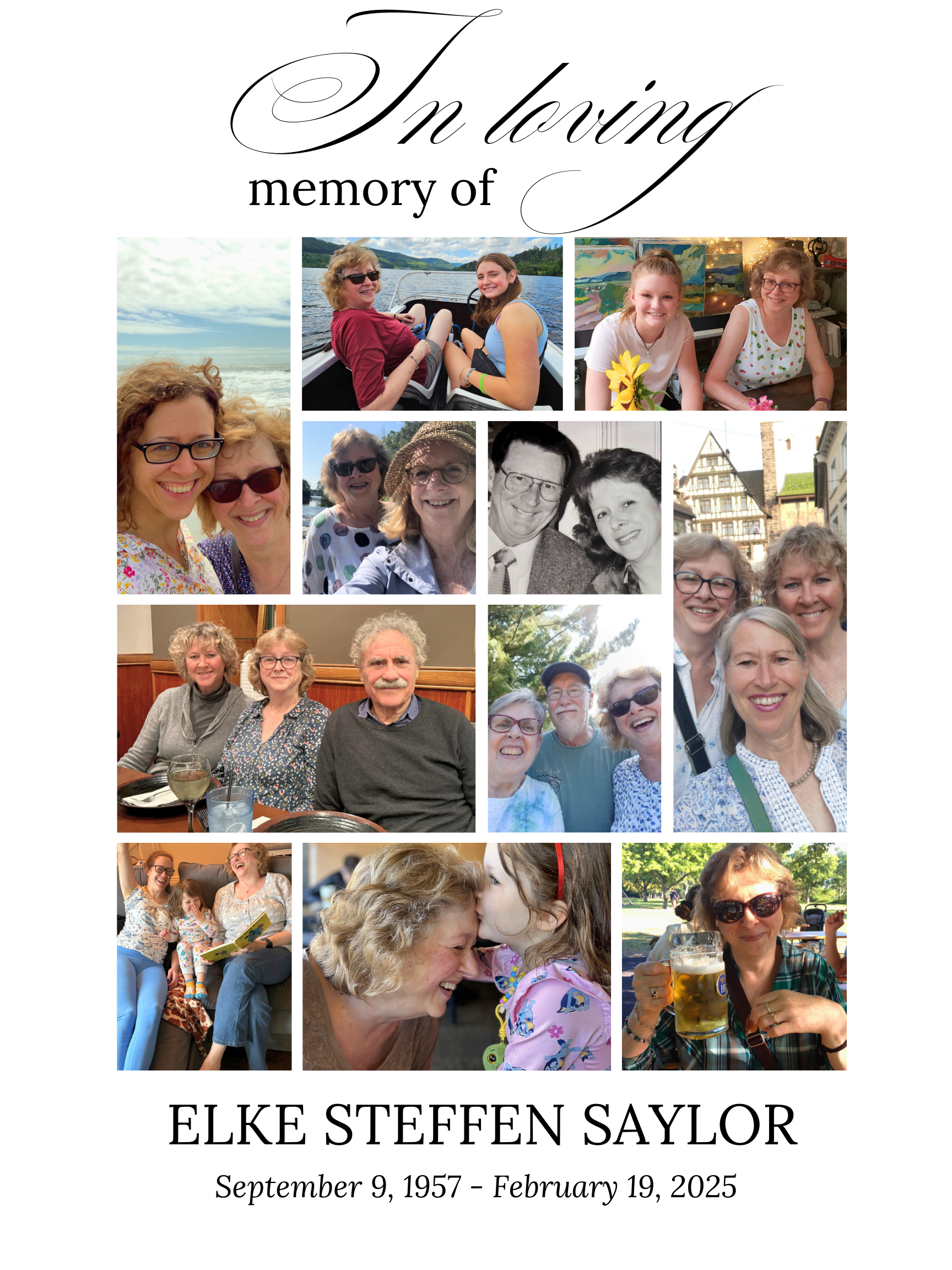 Elke died last Wednesday after several days on round-the-clock comfort medication. One of the first things we did after returning from the funeral home on Thursday was to begin assembling photos to display at the funeral reception.