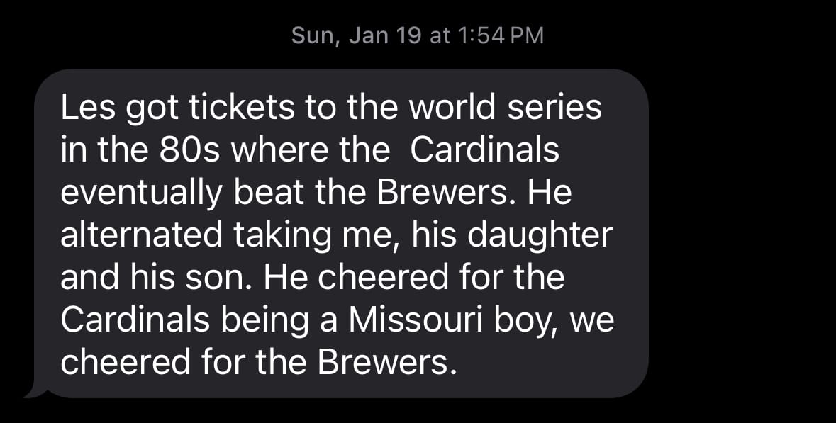 The photo at the top of this post is my favorite of the bunch we chose, perhaps unsurprising in light of my Brewers' fandom. I like that it's one of the unposed photos we chose for display. I love that there's a chance this photo was taken when the Brewers played the Cardinals in the 1982 World Series, which I only recently found out she attended with her husband, Les.